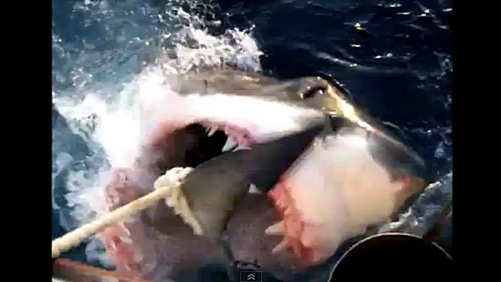 Yeah, maybe it was set up but watching the power of a huge white shark munching a hapless blue is a pretty awesome visual!