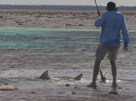 It doesn’t get much crazier than this. An angler standing atop coral on the Great Barrier Reef in water literally ankle deep fights a giant