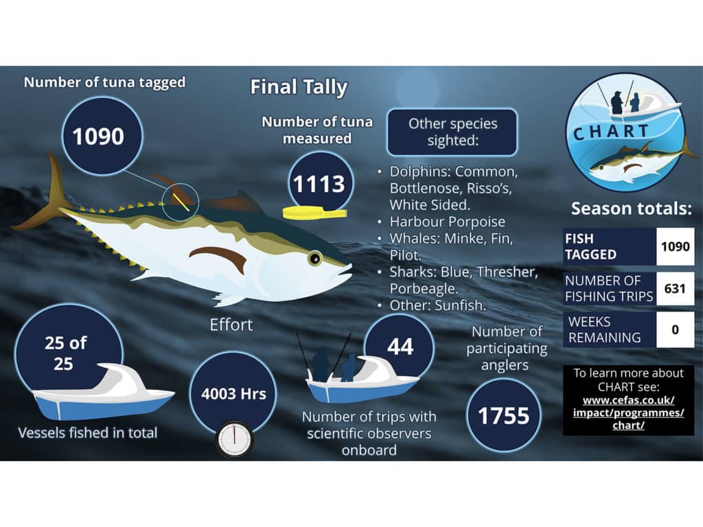In 2022, more than 1,000 bluefin tuna were caught and released. A total of 25 trained captains participated in the second year of the CEFAS CHART program, fishing from Aug. 15 to Dec. 11. According to CEFAS, the boats spent more than 4,000 hours fishing for tuna, with 1,755 anglers participating. The total number of bluefin tuna measured was 1,113, with 1,090 tuna tagged successfully.
