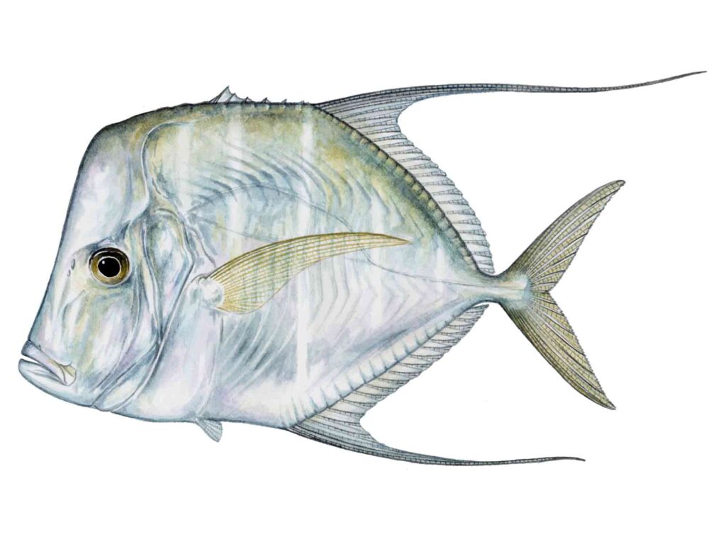 The palometa species is not all that common. Where it’s most often landed is along the sandy beaches and clear waters of southern Florida. Swimming just inside or outside the breakers, palometa have overly elongated dorsal and anal fins almost to the point of looking sinister. In The Lion King, if Mufasa is a permit and Simba is a pompano, then Scar is a palometa. Palometa also have four narrow bars on their sides, with subtle traces of a fifth bar near the tail section.