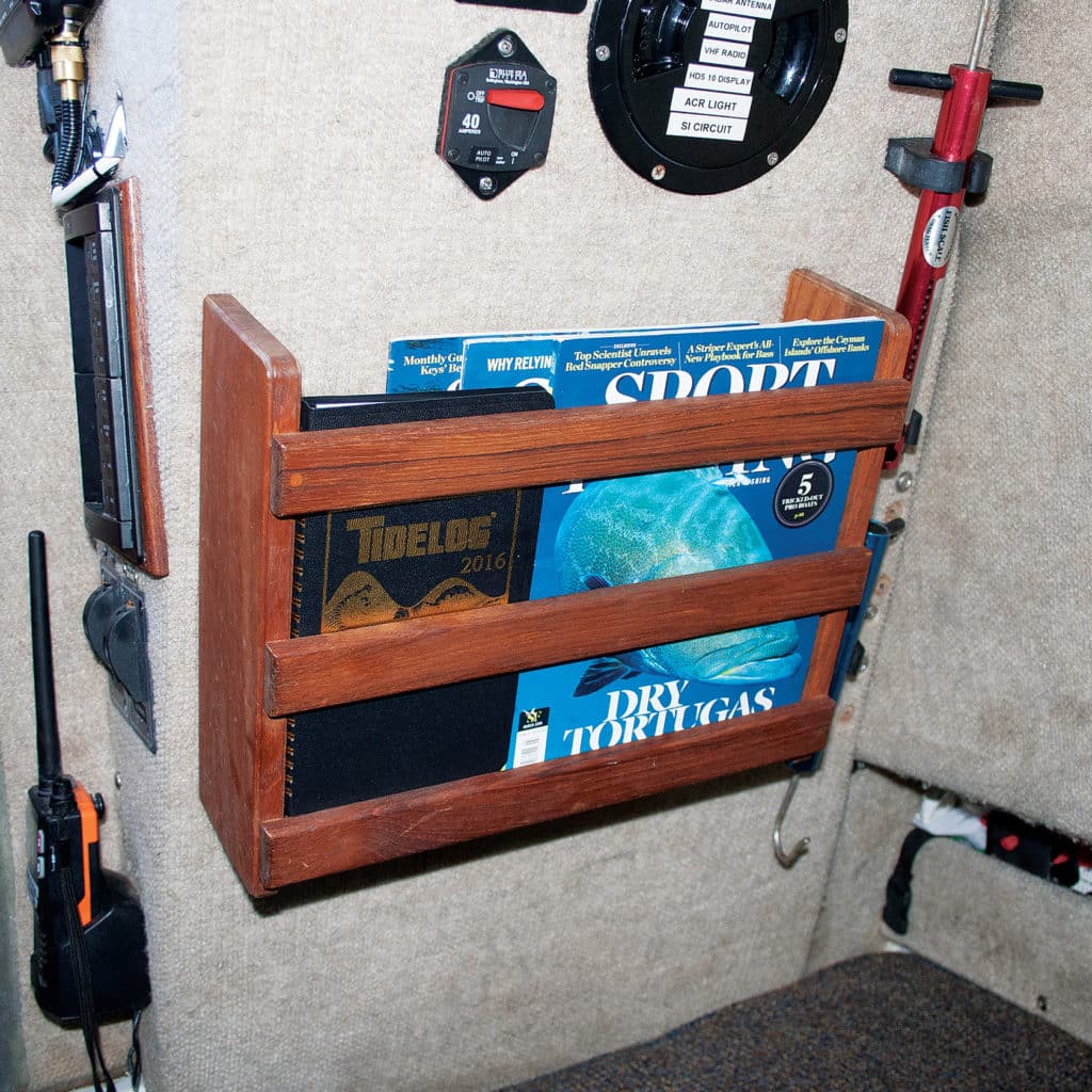 Magazine racks can store fishing regulations, reference books and owner’s manuals in addition to publications.